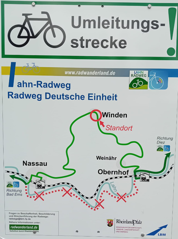 Seit der Sperrung des Lahn-Rad- und Wanderweges sowie des "Radweg Deutsche Einheit" zwischen Obernhof und Nassau hat sich die Verkehrssituation auf der Bundesstraße 417 dramatisch verschlechtert. Der gestiegene Radverkehr auf der Bundesstraße führt zu gefährlichen Begegnungsverkehren zwischen Radfahrergruppen, LKWs, Schülerbussen und PKWs. Die ausgeschilderte Umleitung über Winden, die als Alternative dient, führt über zwei Kreisstraßen, die stark von Motorradfahrern und Kleintransportern genutzt werden. Bereits am letzten Samstag kam es hier bei schönem Wetter zu sehr gefährlichen Situationen. Zudem stellt diese Umleitung einen erheblichen Umweg dar, da die Strecke von Weinähr nach Winden einen Höhenunterschied von 300 m auf 4 km Fahrstrecke aufweist.