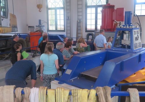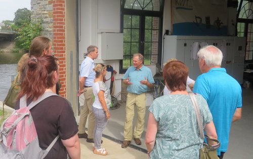 Nach einer kurzen Führung durch die Turbinenhalle ging es im Anschluss vor allen Dingen um den Schutz der Fische und die ökologische Durchgängigkeit der Anlage. Hier wird in beide Richtungen mit geeigneten Mitteln für eine sehr guten Schutz der Tiere gesorgt. Ein Fischaufstieg mit einem Beckenpass, bestehend aus 24 Becken und ein Horizontalrechen mit zwölf Millimetern Stababstand, Aalleitkante und Leitwirkung zum Fischabstieg sowie ein Stillwasserbiotop für Kleinlebewesen und Jungfische sind in die Anlage integriert.